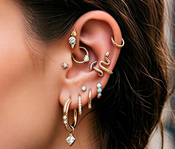 Lóbulo, helix, tragus, conch o rook. Zona muy versátil, ideal para iniciarse o para combinaciones más elaboradas.